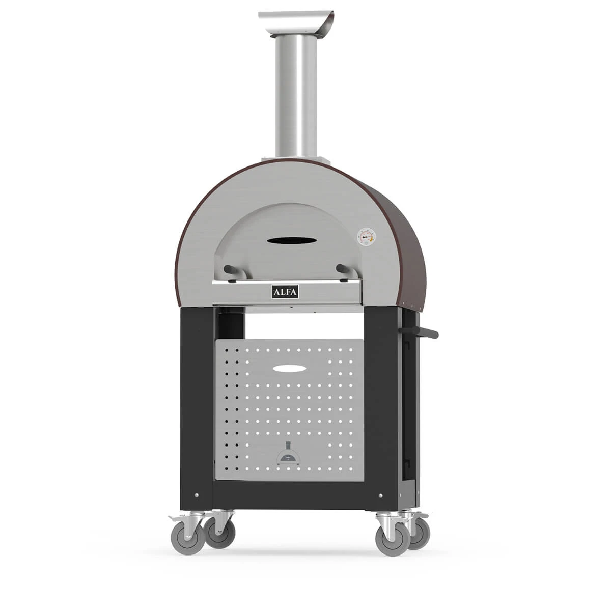 Compact wood-burning oven for pizza and bread. Fit for balconies, terraces and gardens; easily movable thanks to the built-in wheels.