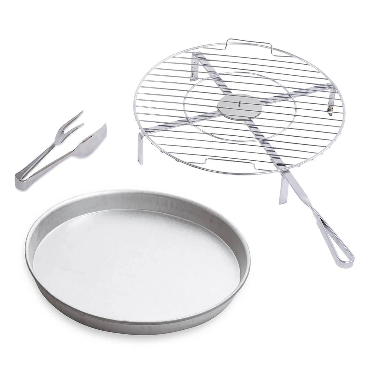 - Steel baking pan:Â it is designed for draining off fat during cooking and for holding embers.