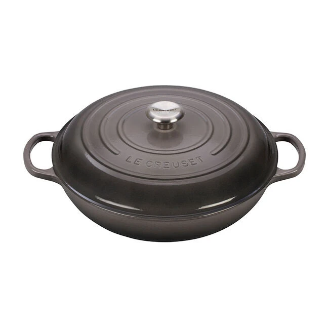 The Le Creuset enameled cast iron Braiser is uniquely designed to provide steady, even heat to transform tough cuts of meat and hearty vegetables into tender, flavorful dishes. The wide base allows ingredients to be placed in a single layer for searing without crowding; once liquid is added, the domed lid circulates steam to lock in moisture and flavor. The versatile shape of the braiser also makes it perfect for shallow frying, steaming, stews, casseroles and serving at the table.
