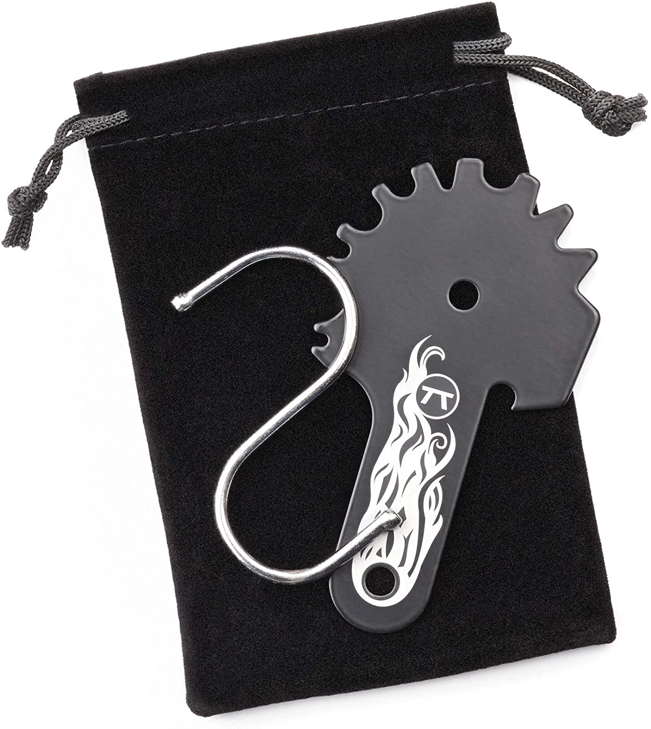5 grooves for v-shaped grates, 6 grooves for round grates, a flat side for griddle and a bonus bottle opener! Includes S-Hook for convenient hanging next to your grill.