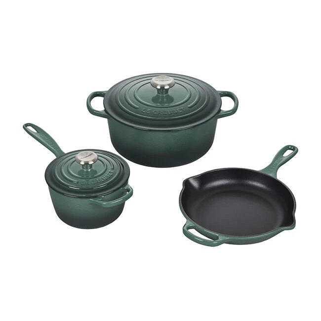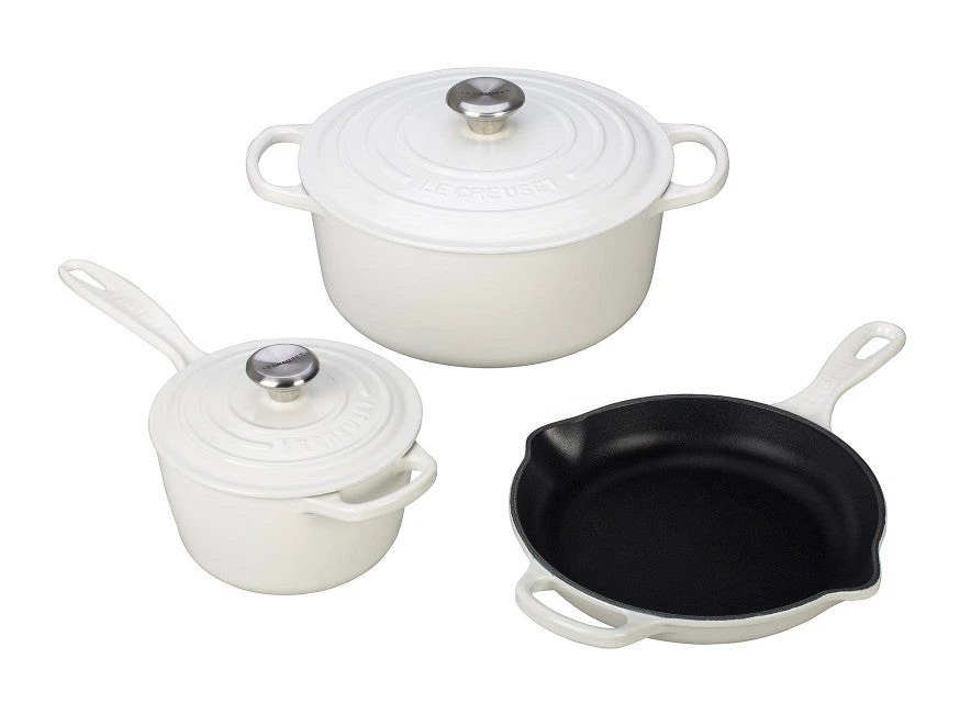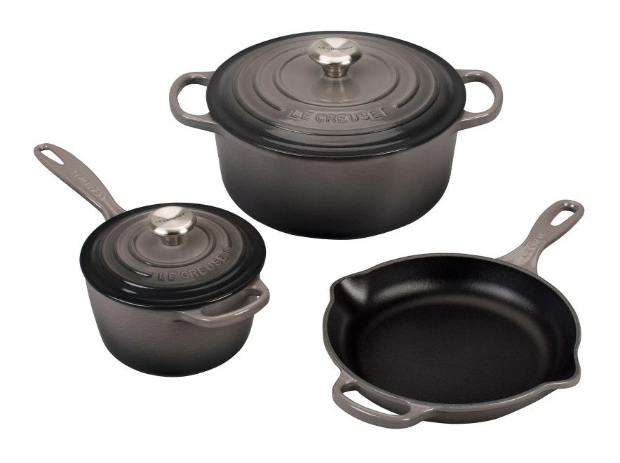 Set includes: 5 1/2 qt. round Dutch oven, 1 3/4 qt. Signature saucepan and 9″ Signature skillet.