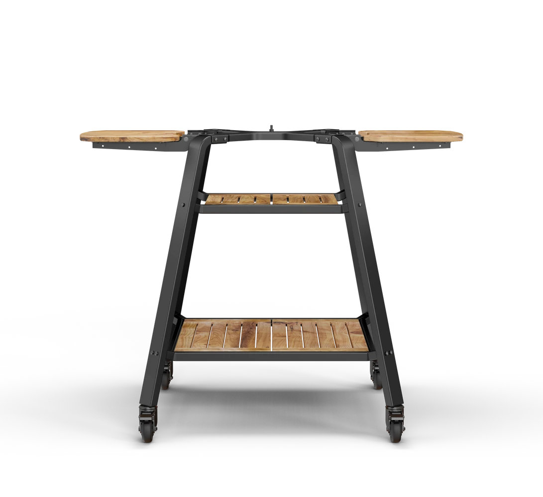 Designed with cooking on the Dome in mind, your oven securely connects to the stand with an easy turn fastener and sits at the perfect height for cooking. The bamboo shelves, hanging hooks and adjustable wings are built in for convenience while the four large wheels make it easy to move your oven around your backyard.