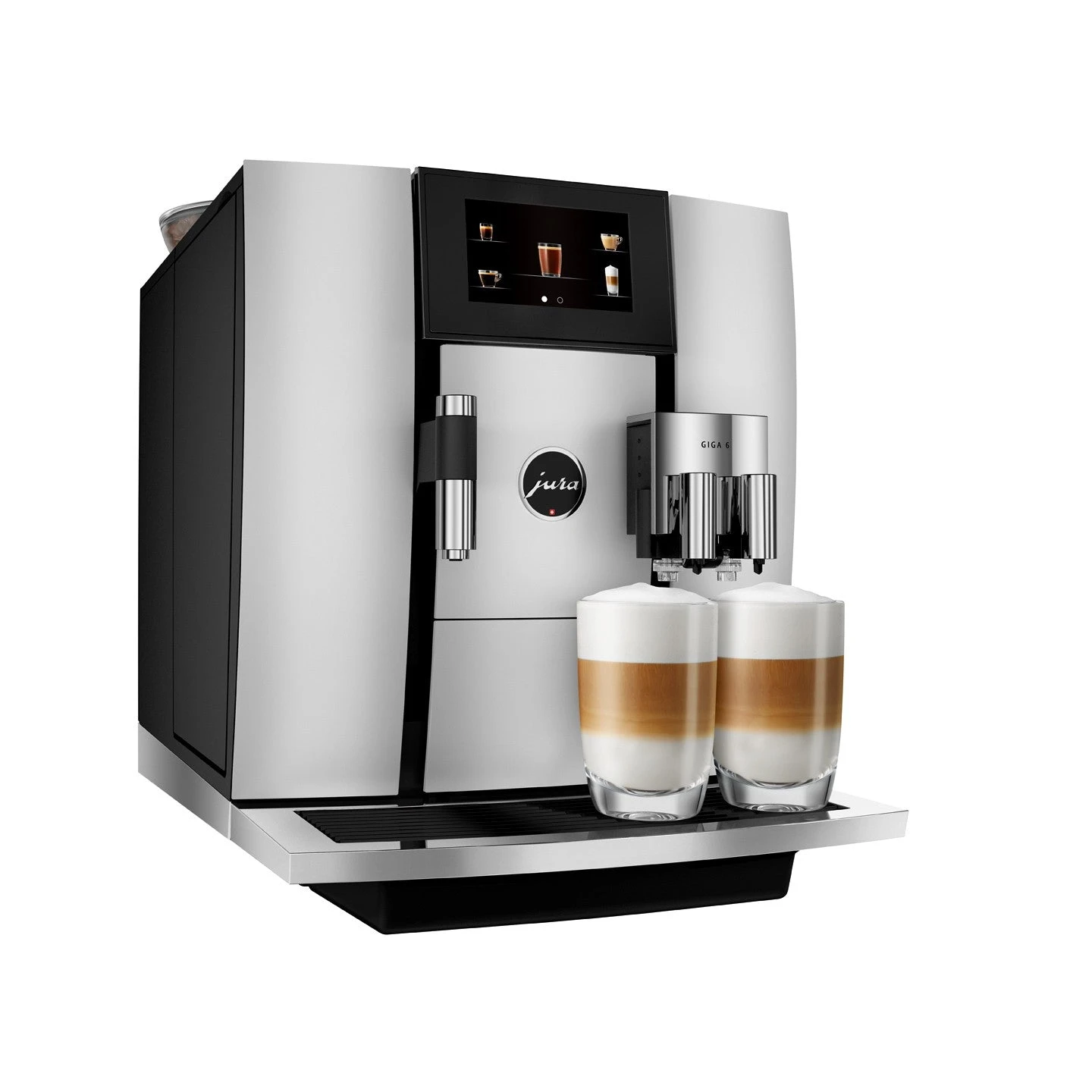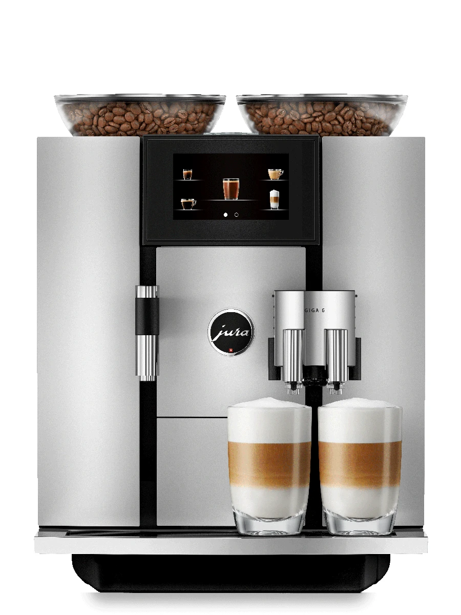 JURA is redefining the concept of automatic coffee machines with the GIGA 6. This professional machine for household use is brimming with the latest technology for outstanding results. Made of top quality materials and with Swiss precision, the GIGA 6’s clear design features radiate power and expertise. The impressive quality of the iconic new automatic coffee machine is emphasized by the solid front section made of 3 mm-thick aluminum and the substantial aroma preservation cover made of chrome-plated, die-cast zinc. Operating this masterpiece of Swiss engineering is completely intuitive thanks to the touchscreen color display and the Blue Crystal Rotary Switch, and the icing on the cake is that coffee lovers can choose from 28 different specialties. 5-star handling on a whole new level is made possible by artifical intelligence and the ingenious design, which has been carefully considered right down to the very last detail.