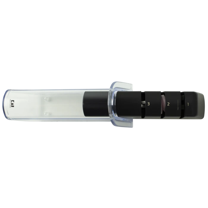 The Kai Diamond and Ceramic Retractable Sharpener sharpens knives easily with a simple 3-step process. The left- or right-handed sharpener is set to the 16-degree angle required to sharpen any Kai straight-edged, double-bevel blade. Just pull the knife through the first slot for rough sharpening, the second slot for refinement, and the third slot for finishing. Your knife’s razor sharpness is restored and ready to go to work. Includes retractable cover for easy, compact storage.