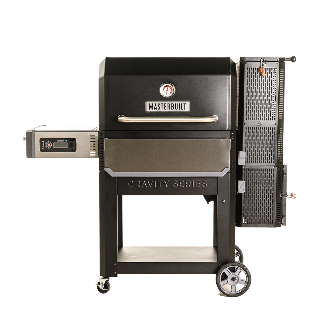 With the Gravity Series™ 1050 Digital Charcoal Grill + Smoker by Masterbuilt, you can smoke, grill, sear, bake, roast and so much more. Set the temperature on the digital control panel or your smart device and the DigitalFan™ maintains the desired cooking temperature. The GravityFed™ charcoal hopper holds up to 8 hours of charcoal and gravity ensures you have constant fuel to the fire. The reversible smoke + sear cast-iron grates and FoldAway™ warming + smoking racks add up to a total of 1050 square inches of cooking space. Master the art of charcoal grilling and smoking with Masterbuilt.
