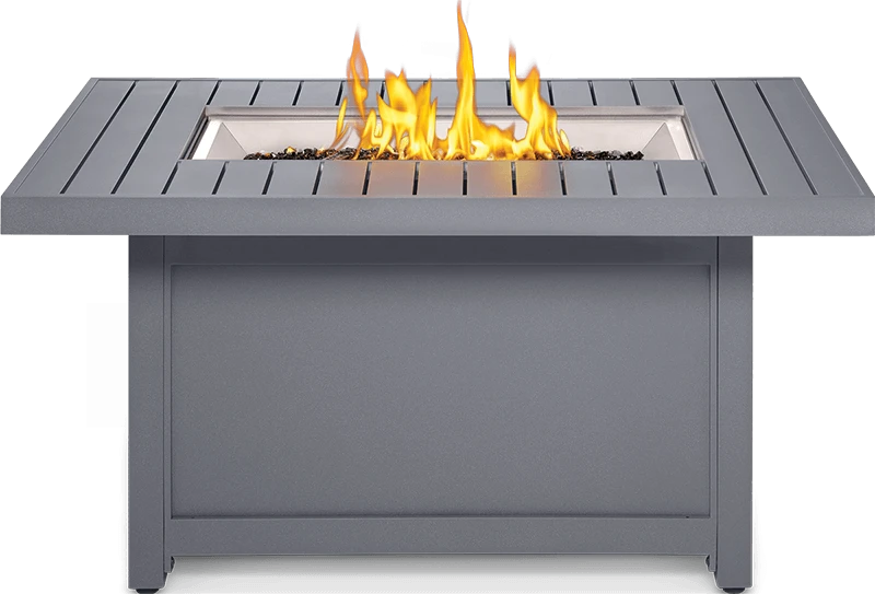 A stylish linear design sets the Napoleon Hamptons Rectangular Patioflame® Table apart from the rest. The stylish linear design with a contemporary look to suit any décor. Gather round and relax in front of the beautiful dancing flames. Safe and fuel efficient, the Hamptons Rectangular Patioflame® Table features a thermocouple valve that cuts the gas when flame is interrupted, meaning that if a gust blows the flame out, or you forget to shut the gas when you’re done, no gas will be wasted. The beautifully constructed, durable, aluminum surround conveniently hides a gas tank (propane models). Never worry about the weather, drainage holes in the burner pan allow the rain to drain away, and the optional windscreen will protect the flames from the wind. Set your drinks down, converse in comfort and enjoy your outdoor living space. Easily convert your Hamptons Rectangular Patioflame® Table into a fully functioning table with the burner lid (included).