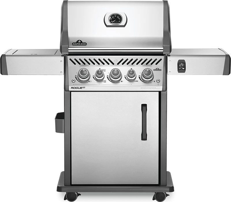 The Napoleon Rogue® SE 425 Stainless Steel Natural Gas Grill with Infrared Side Burner and Rear Burner is a durable stainless steel grill. Featuring three main burners, a rear rotisserie burner, and a high top lid, this grill has everything you need to create gourmet meals. Sear restaurant-style steaks on the integrated sear station, while generous side shelves provide plenty of prep space.