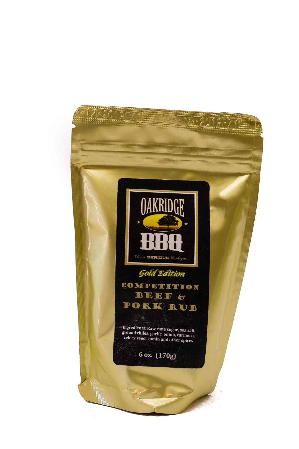 The rub that started it all for Oakridge BBQé The Original éCOMP rubé; Competition Beef & Pork. Bold and flavorful with a subtle but noticeable background heat are the trademarks of this All-Natural Gold Series rub. Big flavors that marry perfectly with big, bold cuts of meat like rib-eyes, porterhouses, strip loins, beef brisket, burgers, chops, duck,pulled pork and pork spareribs. Perfectly balanced sweet/heat/savory/salty flavor profile with thebold aromas of chilies,cumin and celeryin the front with the smoky sultry heat of chipotle peppers in the finish. This is a serious competition-grade rub folks!, but feel free to use it on just about anything you can think of!