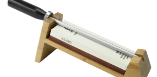 The Shun 3-Piece Sharpening System makes it easy to sharpen on a whetstone. The angled bamboo stand helps you maintain the proper sharpening angle. Made in Japan.
