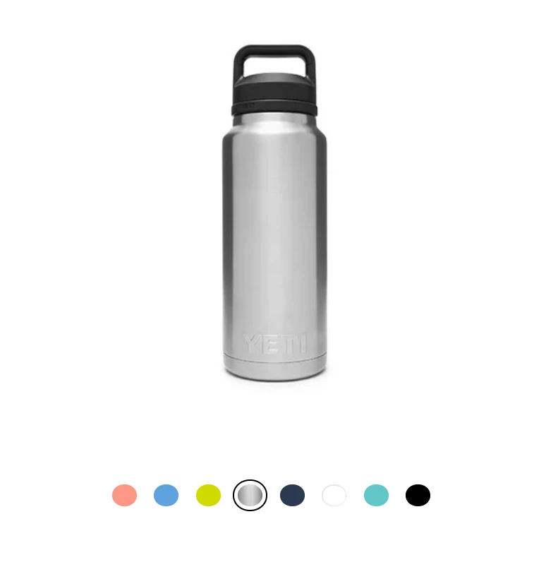 The Rambler® 36 oz. Bottle is a necessary addition to your day hikes, kayak trips, and daily commutes. This tough bottle is double-wall vacuum insulated to keep your water cold (or coffee hot) until the last sip and comes with a Chug Cap. Separate your Rambler from the herd – Rambler Bottles are available in stainless and DuraCoat™ Colors that won’t fade, peel, or crack.